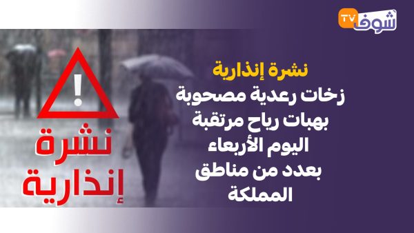 أفادت المديرية العامة للأرصاد الجوية بأنه يرتقب تسجيل زخات رعدية (من 20 إلى 30 ملم) مصحوبة بهبات رياح، اليوم الأربعاء، بعدد من مناطق المملكة.
