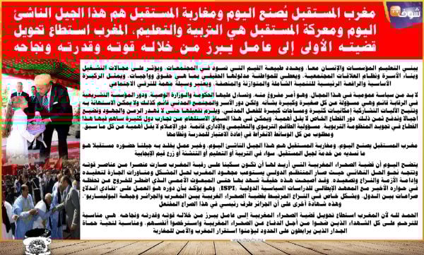 مغرب المستقبل يصنع اليوم، ومغاربة المستقبل هم هذا الجيل الناشئ اليوم، وخير عمل يخلد به جيلنا حضوره مستقبلا هو ما نسديه من خدمة لجيل المستقبل، سواء في التربية أو التعليم أو التنشئة أو زرع قيم الإيجابية.